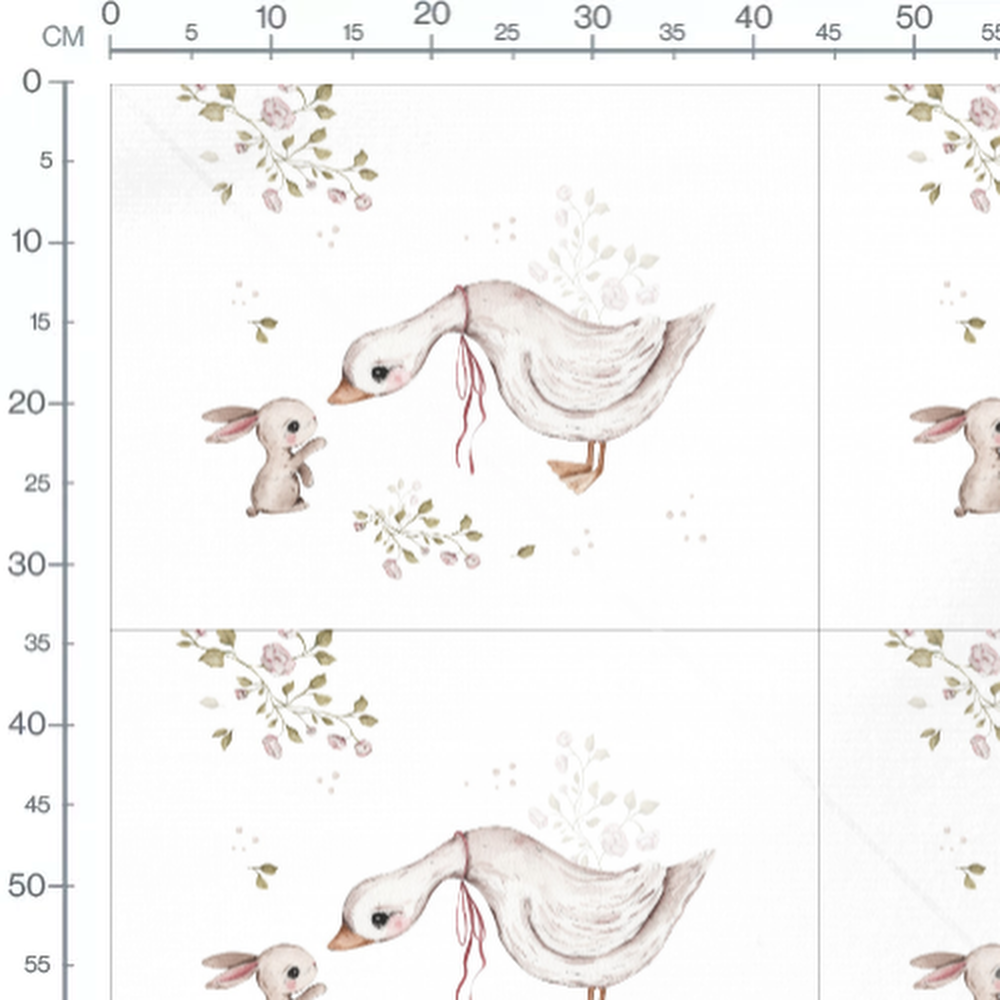 L'oie porte un ruban rouge autour du cou. Le lapin est assis face à l'oie. Des petites fleurs roses et des feuilles vertes décorent le fond blanc.Les tissus