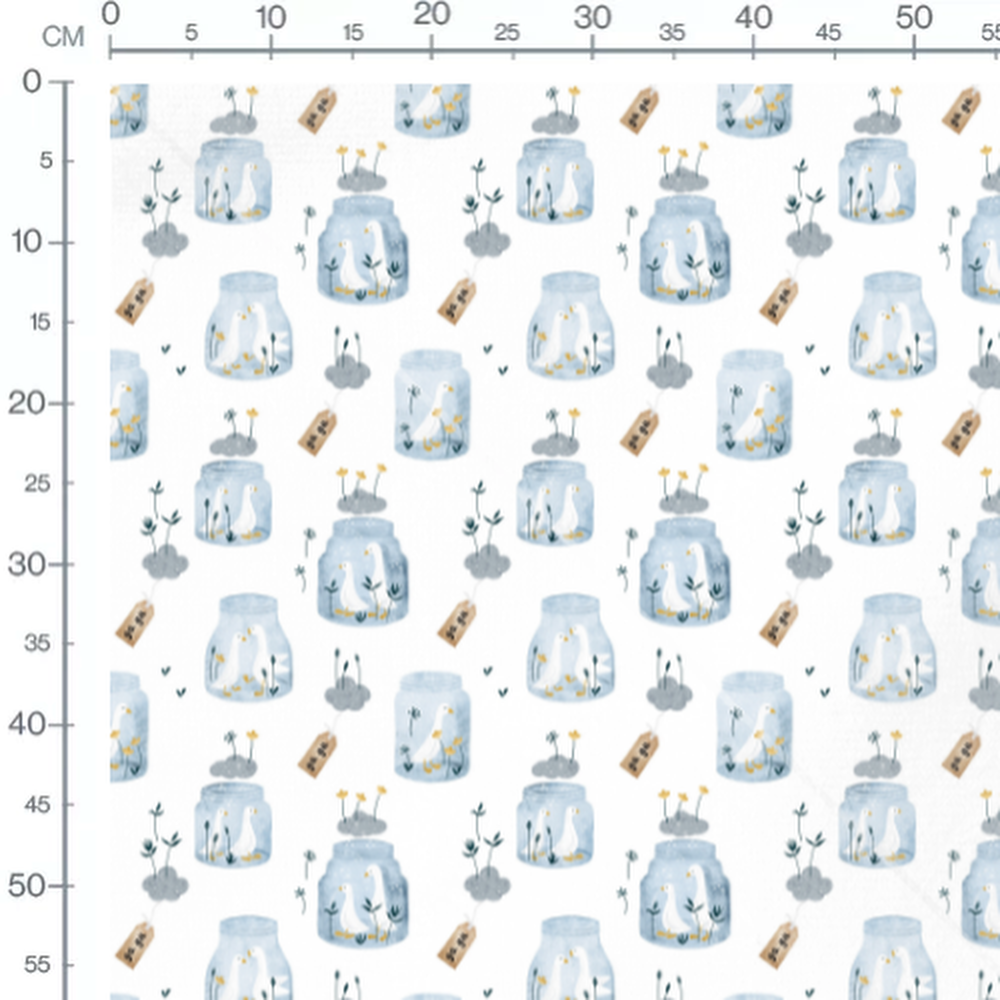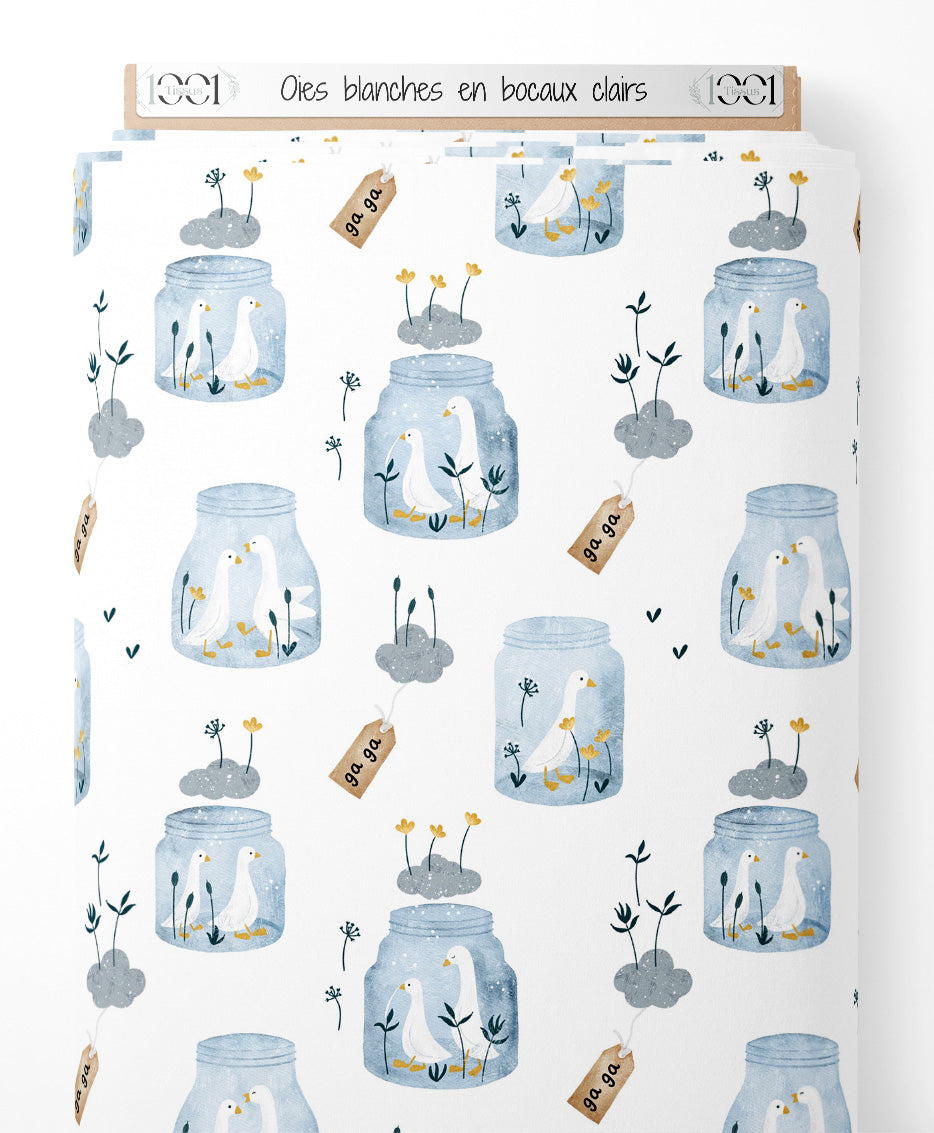 Les bocaux contiennent des oies blanches avec des détails de fleurs et de feuillage. Des étiquettes avec l'inscription 'ga ga' sont attachées aux bocaux. De petites fleurs jaunes et des nuages gris complètent le motif.Les tissus