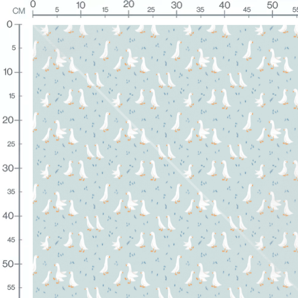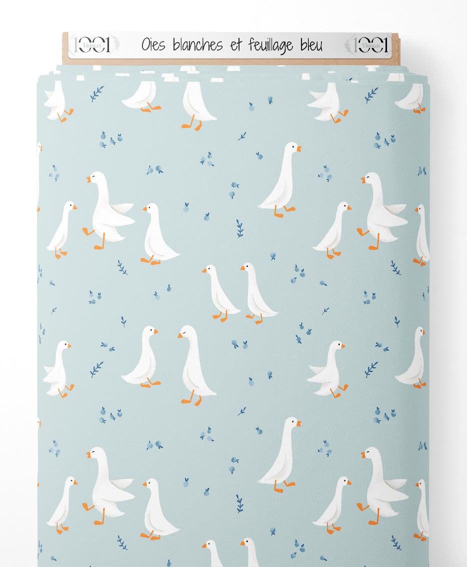 Les oies sont dessinées avec des détails simples, mettant en valeur leur silhouette blanche. Le fond bleu clair est parsemé de petites feuilles et fleurs bleues, ajoutant une touche de nature au motif.Les tissus