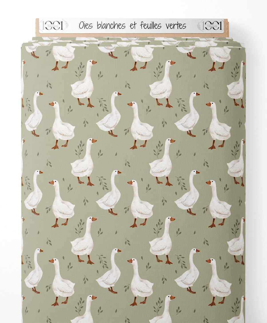 Les oies sont dessinées avec des détails réalistes. Le fond vert est agrémenté de motifs de petites feuilles.Les tissus