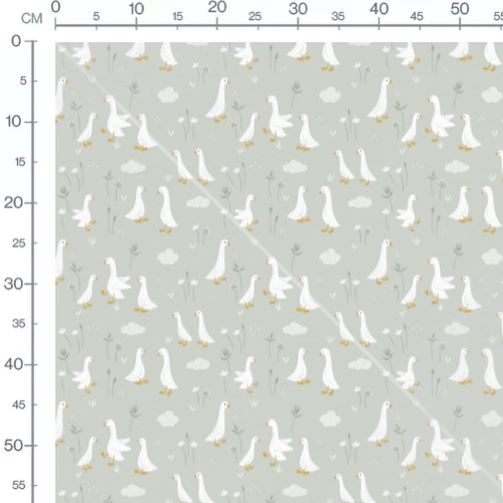 Les oies sont dispersées parmi des fleurs délicates et des nuages doux. Les fleurs sont de petites tailles avec des nuances de gris et de blanc. Le fond gris clair ajoute une touche apaisante à l'ensemble du motif.Les tissus