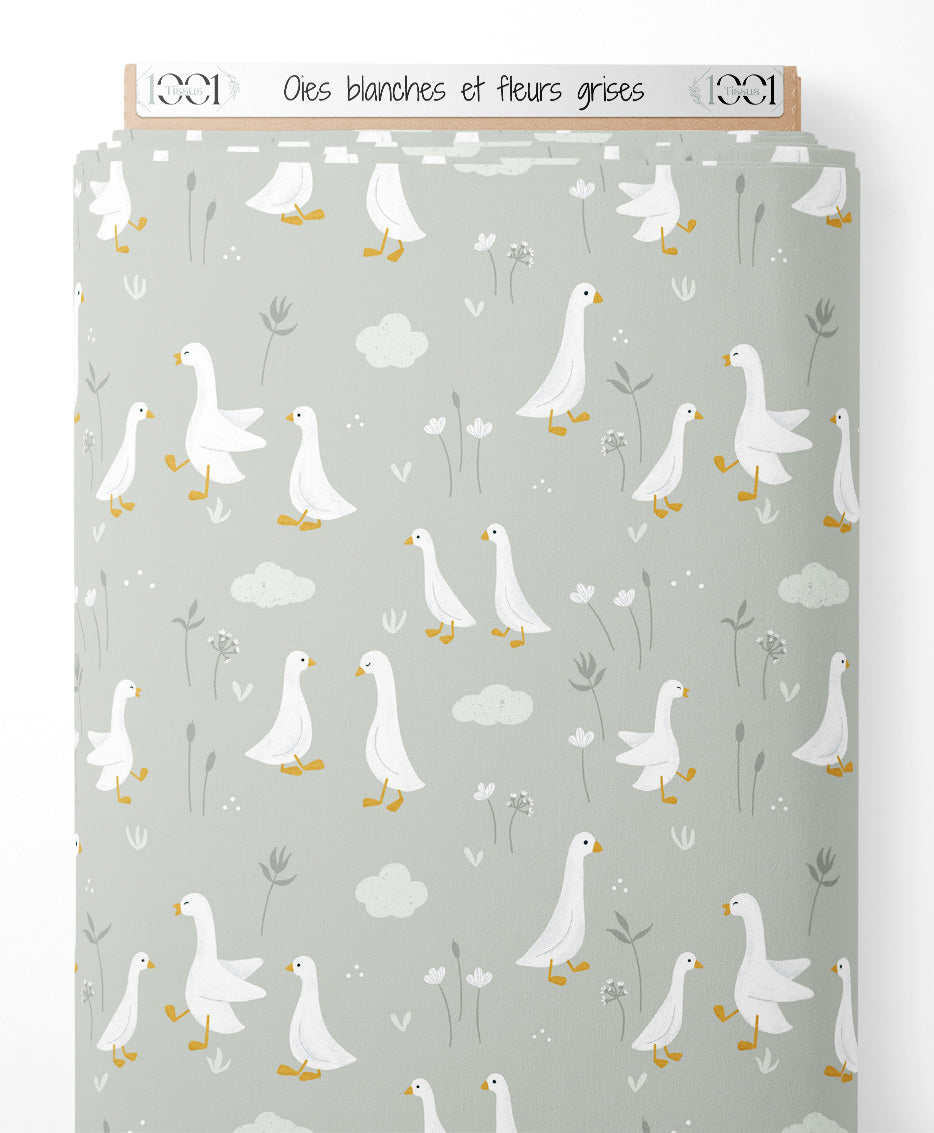 Tissu - Oies blanches et fleurs grises