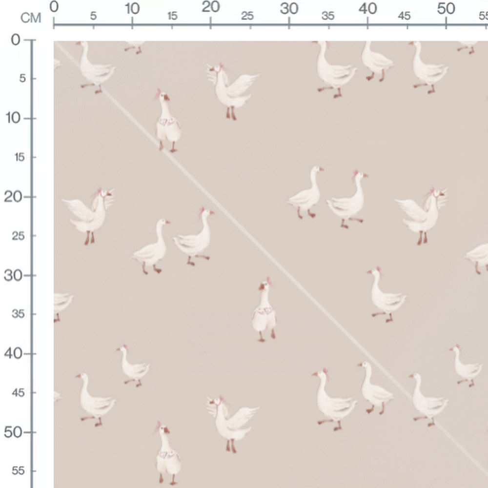 Certaines oies portent des nœuds roses sur la tête. Les oies sont réparties uniformément sur le fond beige.Les tissus
