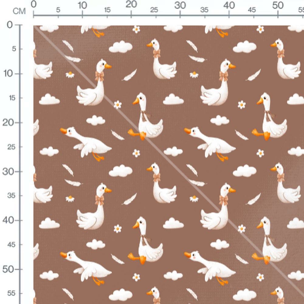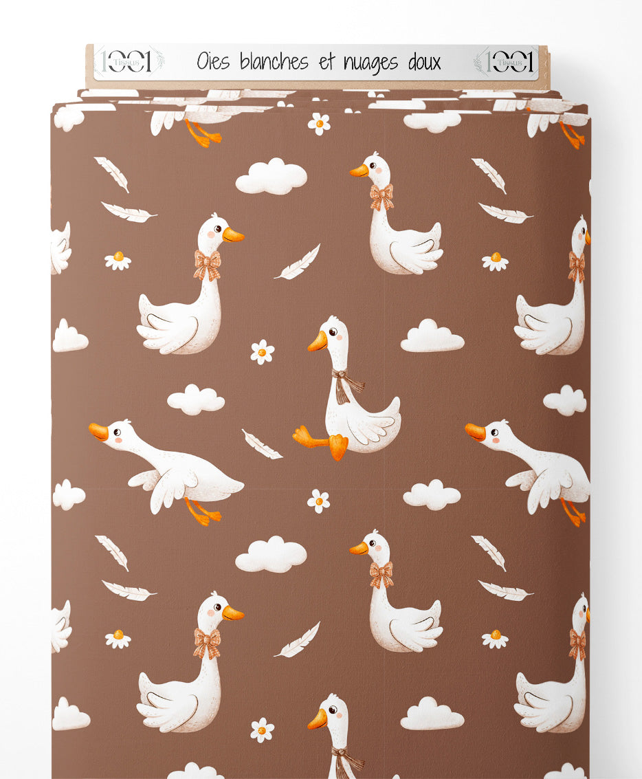 Plumes blanches flottant autour des oies. Les oies ont des becs orange vif. Petites marguerites blanches ajoutent une touche de douceur.Les tissus