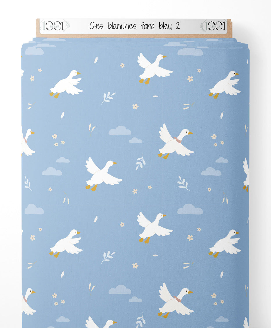 Les oies ont des becs et pattes orange. Quelques feuilles blanches ajoutent des détails au motif.Les tissus
