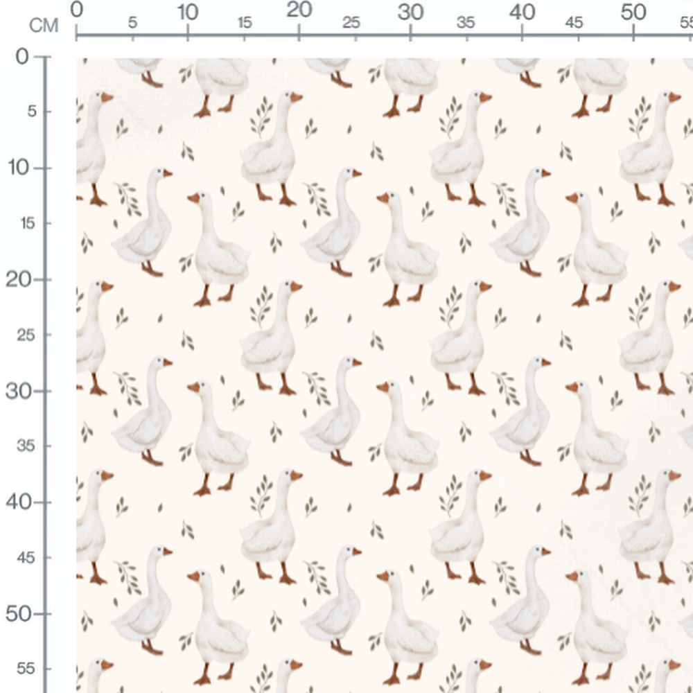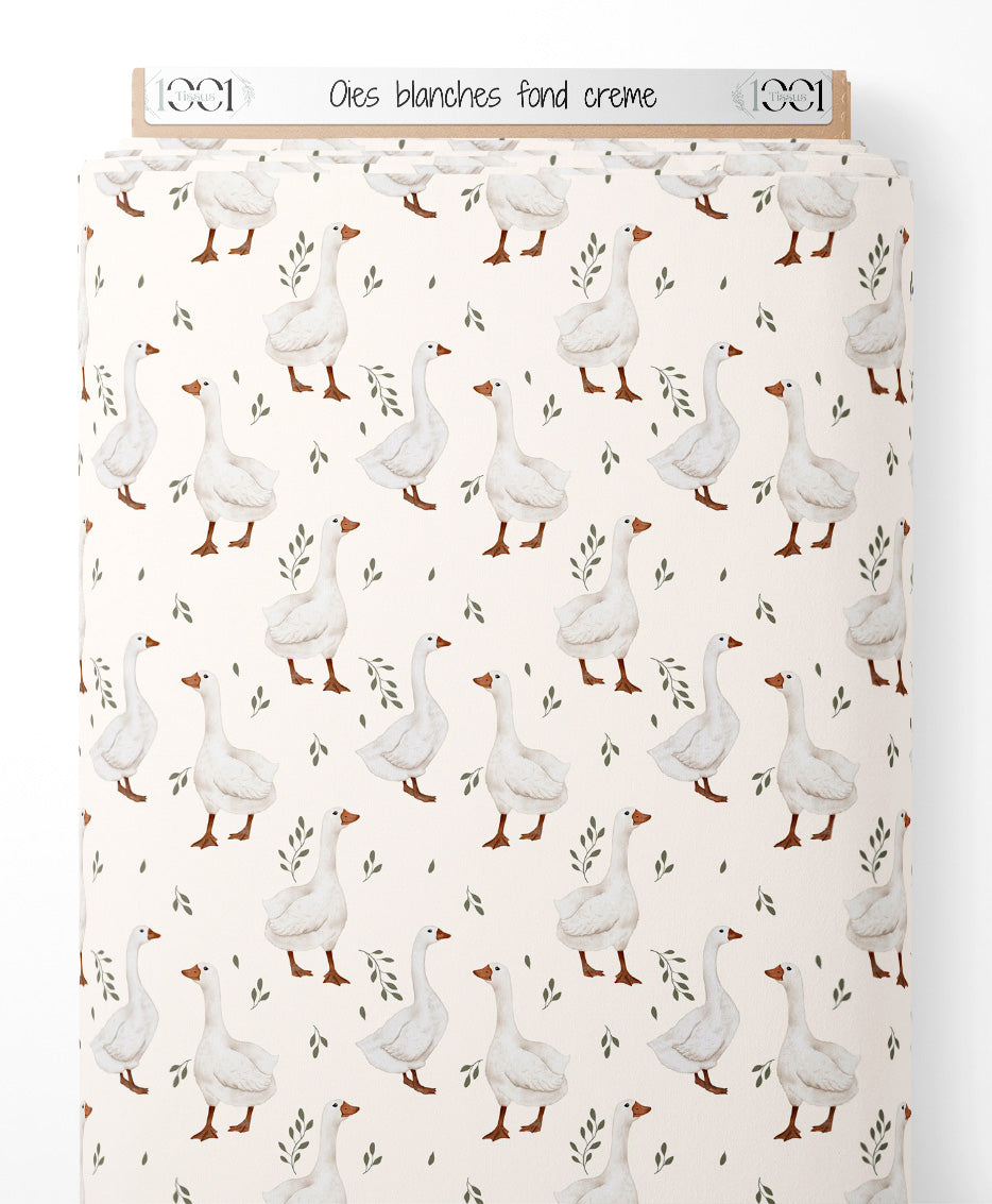 Les oies sont dessinées avec des détails réalistes. Les feuillages ajoutent une touche naturelle au motif.Les tissus