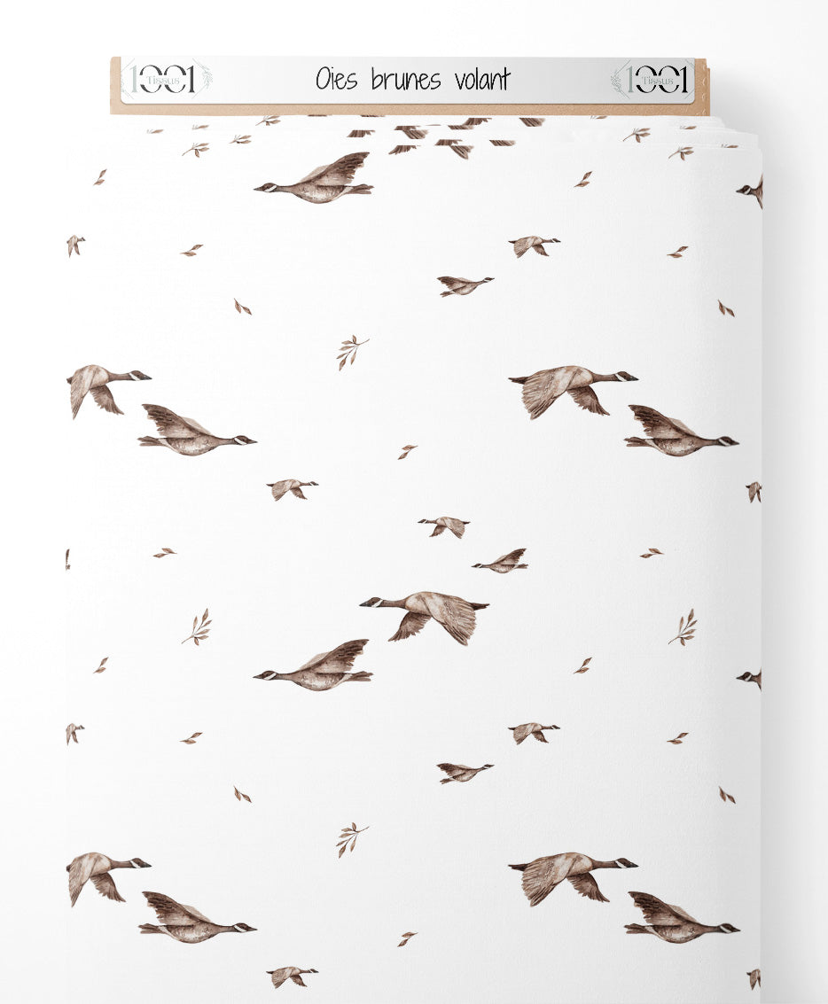 Les oies sont dessinées avec des détails fins et des nuances de brun. Les plumes ajoutent une touche de mouvement et de légèreté au motif.Les tissus
