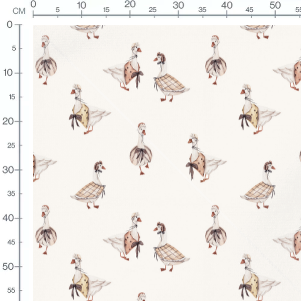Les oies portent des chapeaux assortis à leurs robes. Les motifs des robes incluent des carreaux et des pois. Les oies sont dessinées dans un style aquarelle.Les tissus