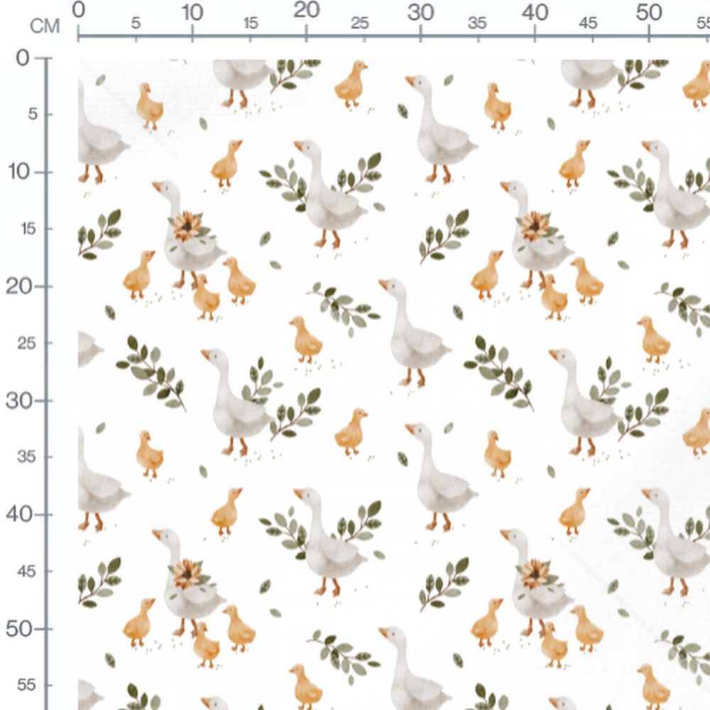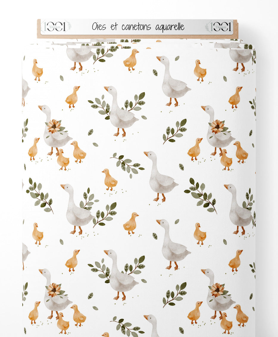 Les oies sont accompagnées de canetons de différentes tailles. Les feuilles vertes ajoutent une touche naturelle au motif. Les oiseaux sont dessinés dans un style aquarelle doux.Les tissus