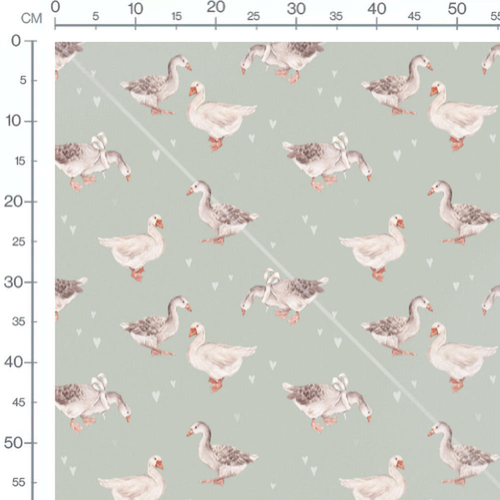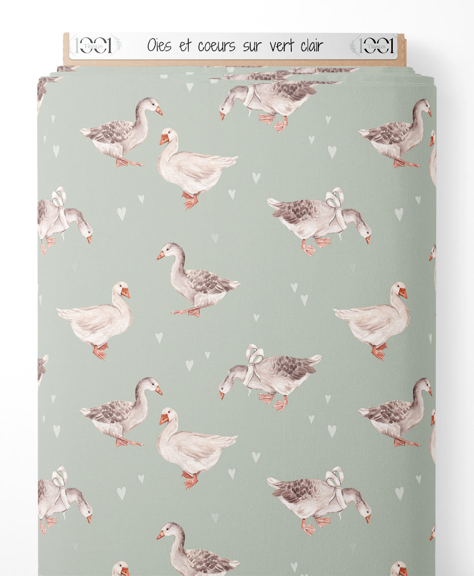 Les oies sont dessinées avec des détails réalistes. Les cœurs ajoutent une touche douce au motif.Les tissus