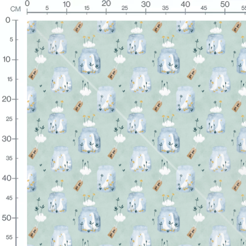 Les bocaux contiennent des oies blanches entourées de petites fleurs jaunes. Des nuages blancs flottent à côté des bocaux. Des étiquettes marron avec l'inscription 'ga ga' sont dispersées sur le fond vert.Les tissus