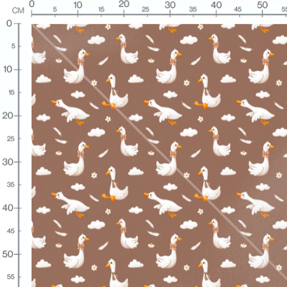 Plumes blanches dispersées entre les oies. Les oies ont des becs et pattes orange. Petites fleurs blanches avec centres jaunes ajoutent une touche de couleur.Les tissus