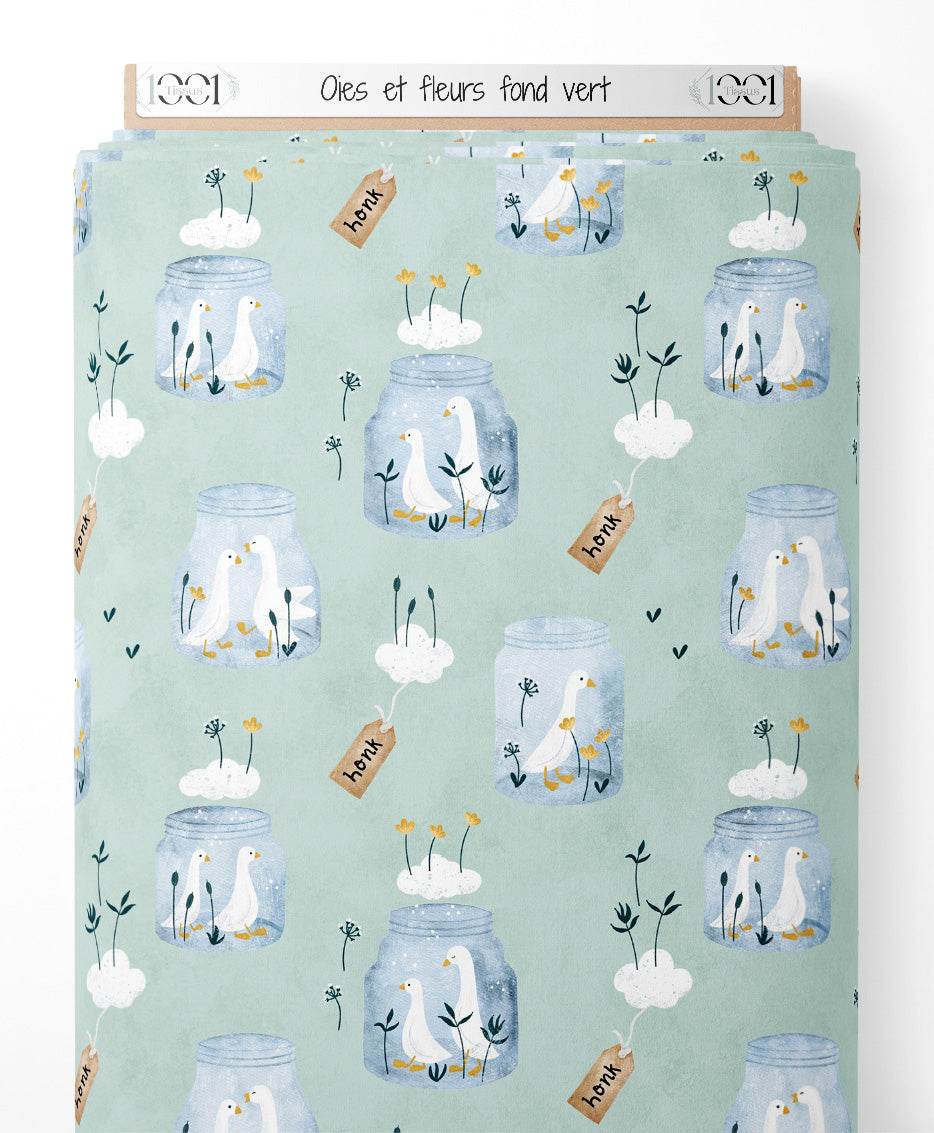 Les oies sont accompagnées de petites fleurs jaunes et blanches. Les bocaux sont transparents avec des détails floraux. Des nuages blancs et des étiquettes marron avec le mot 'honk' complètent le motif.Les tissus