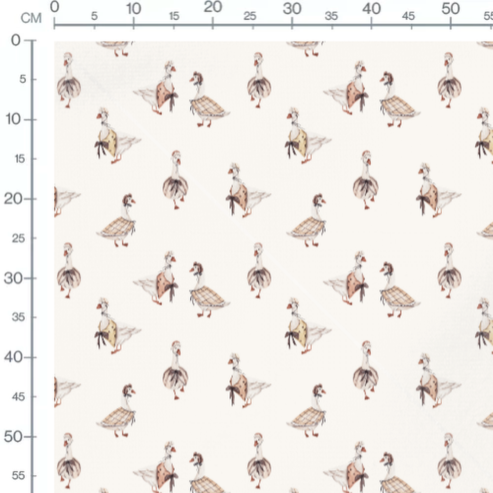 Les oies portent des chapeaux assortis à leurs robes. Les couleurs dominantes sont le beige, le brun et le blanc. Chaque oie a une pose différente, ajoutant du dynamisme au motif.Les tissus