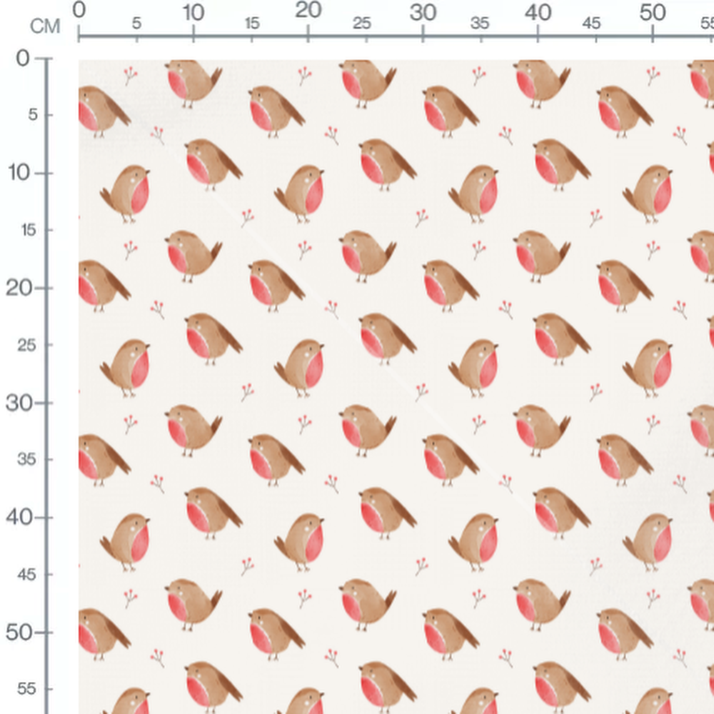 Les oiseaux ont un corps brun et un ventre rose vif. Le fond blanc met en valeur les détails des oiseaux. De petites baies rouges ajoutent une touche de couleur supplémentaire.Les tissus