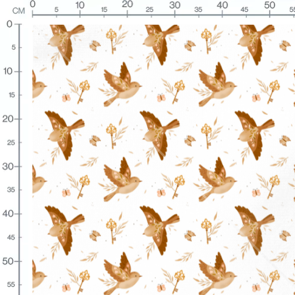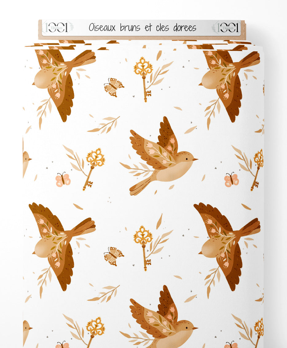 Les oiseaux ont des ailes détaillées avec des motifs floraux. Les clés dorées sont ornées de motifs délicats. Les papillons ajoutent une touche de légèreté au motif. Les feuilles beige apportent une harmonie naturelle.Les tissus