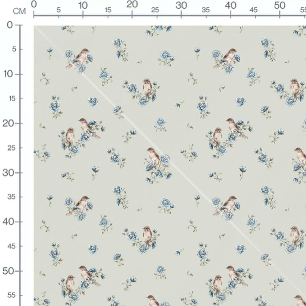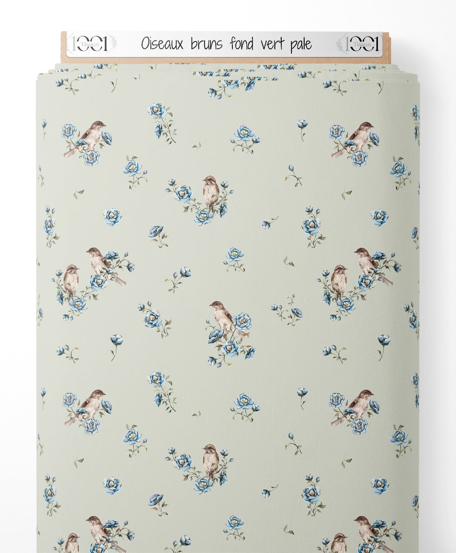 Les oiseaux bruns sont délicatement posés sur des branches de roses bleues. Les fleurs bleues sont accompagnées de quelques feuilles vertes. Le fond vert pâle met en valeur les motifs floraux et les oiseaux.Les tissus
