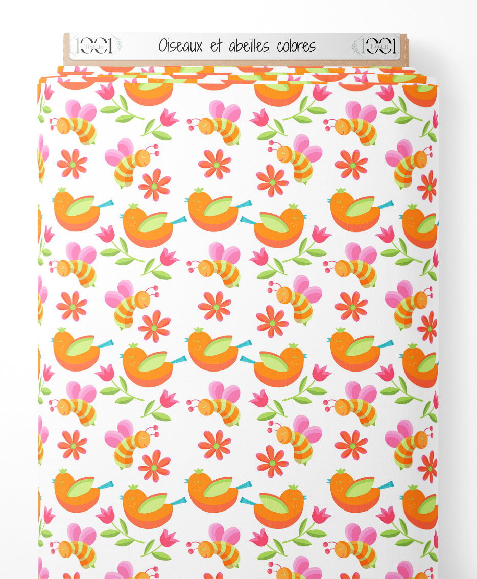 Les oiseaux sont illustrés en orange avec des ailes vertes. Les abeilles ont des rayures jaunes et oranges avec des ailes roses. Les fleurs sont de couleur rose vif avec des feuilles vertes.Les tissus
