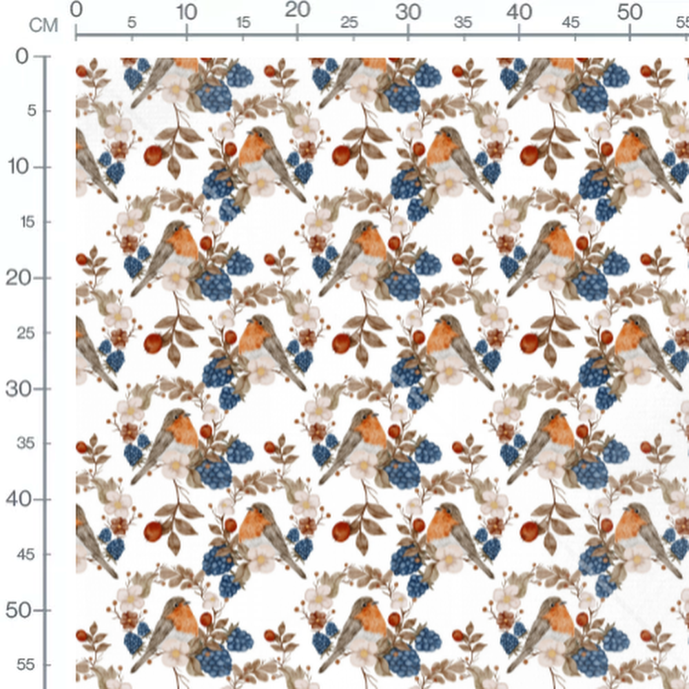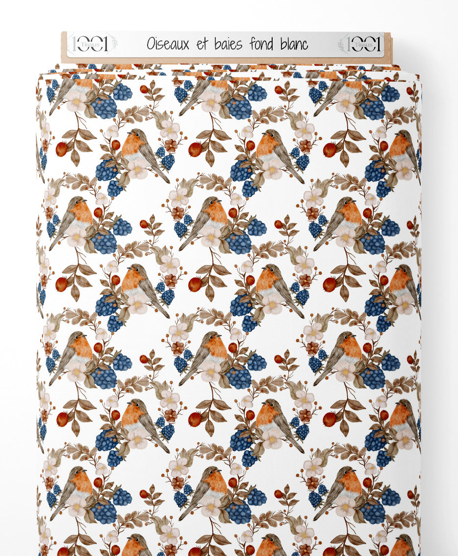 Les oiseaux arborent des teintes orange vif et gris doux. Les baies sont d'un bleu profond, entourées de feuilles marron. Des fleurs blanches ajoutent une touche délicate au motif. Le fond blanc met en valeur chaque élément du design.Les tissus