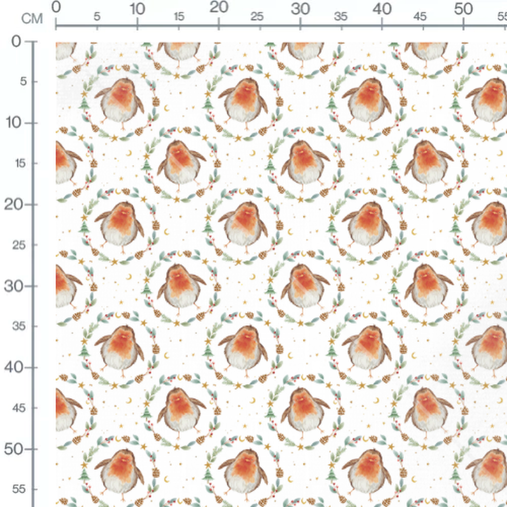 Les oiseaux ont une poitrine orange et sont entourés de petites baies rouges. Des étoiles dorées et des croissants de lune complètent le motif festif.Les tissus