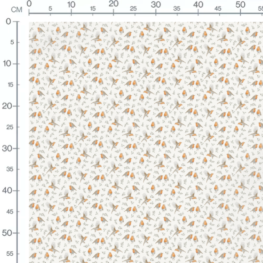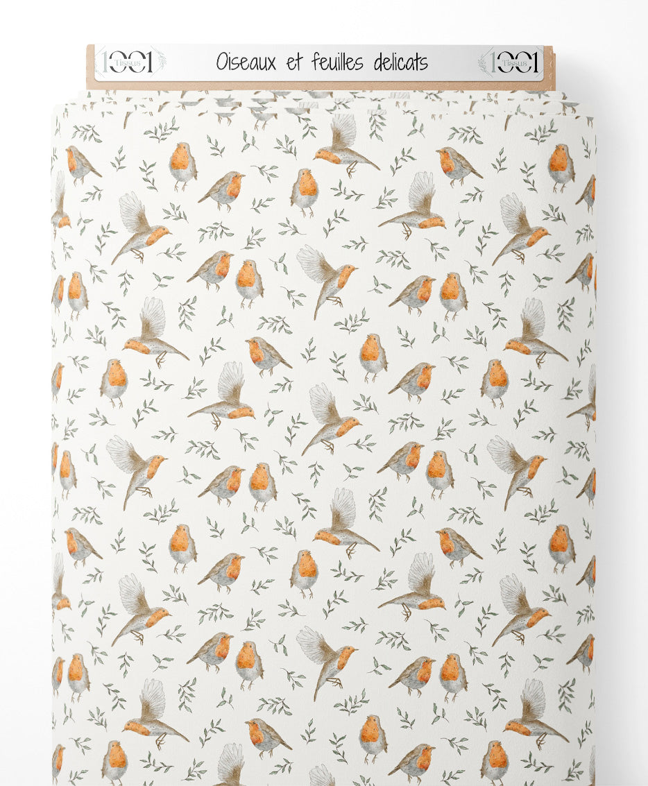 Les oiseaux sont représentés avec des nuances d'orange et de gris. Les feuilles sont petites et de couleur verte, ajoutant une touche naturelle au motif.Les tissus