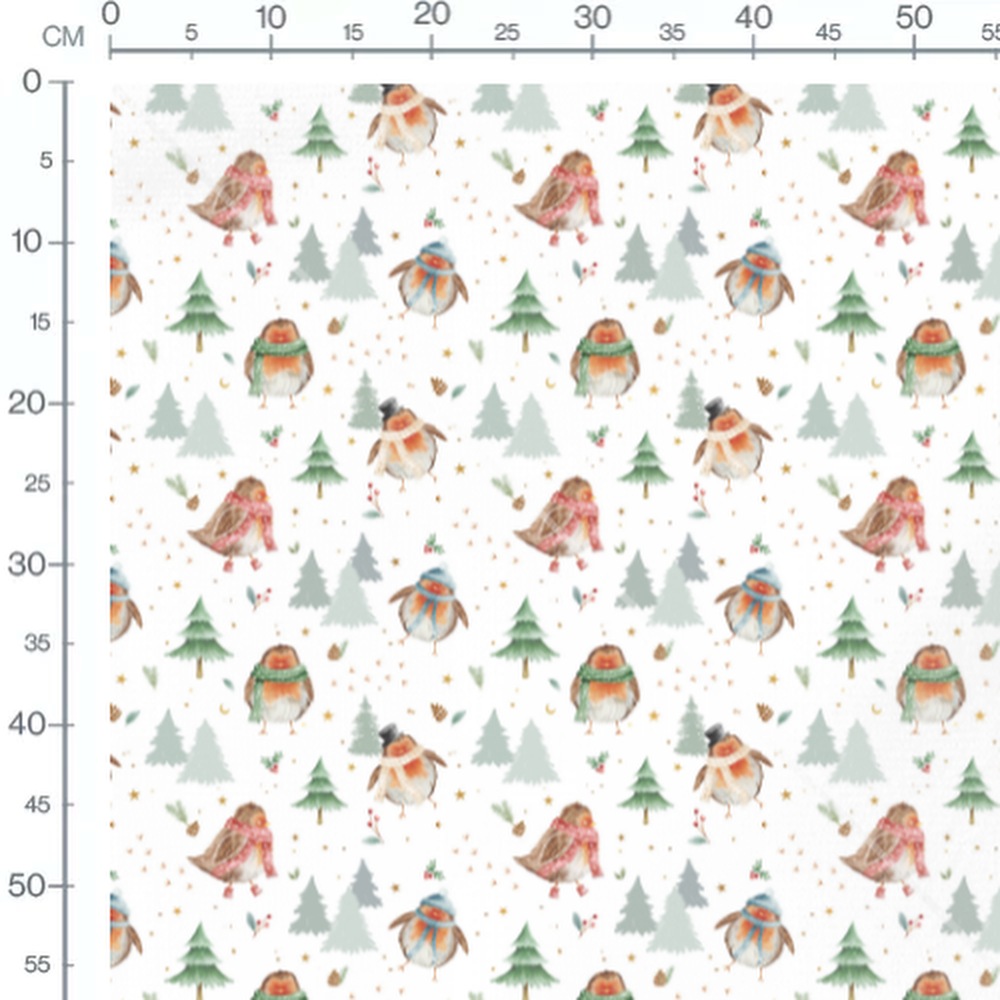 Les oiseaux portent des écharpes rouges, vertes et bleues. Des sapins verts et des branches de houx ajoutent une touche festive. Des étoiles dorées et des pommes de pin complètent le motif hivernal.Les tissus