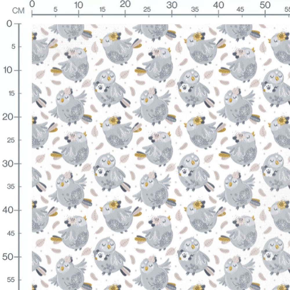 Les oiseaux sont décorés de motifs floraux délicats. Des feuilles et des points beige parsèment le fond. Les becs et les pattes des oiseaux sont de couleur jaune.Les tissus