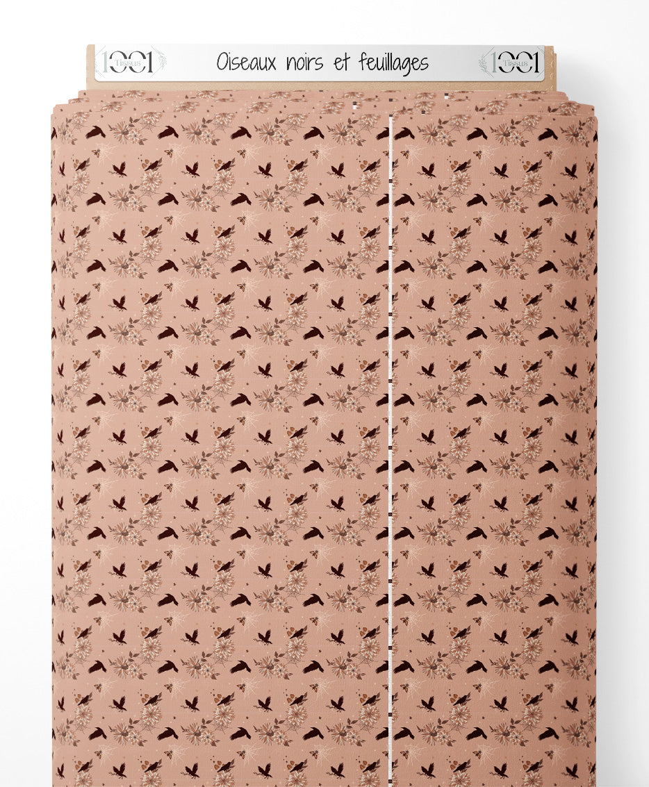 Les oiseaux noirs contrastent avec les feuillages bruns délicats. Des petites fleurs et papillons ajoutent des détails subtils. Le fond beige crée une ambiance douce et naturelle.Les tissus