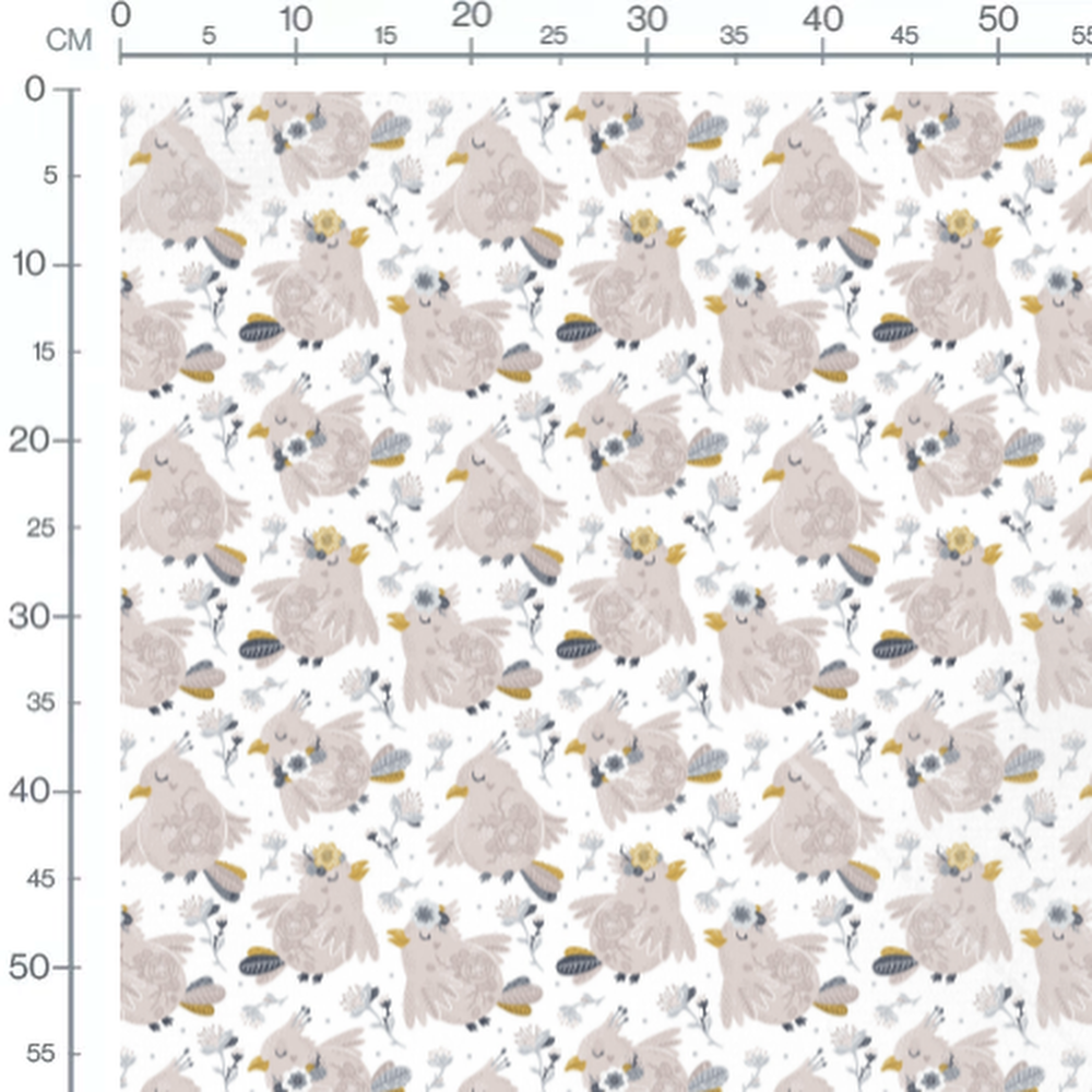 Les oiseaux sont ornés de motifs floraux détaillés. Les fleurs et feuilles ajoutent une touche de couleur avec des tons de gris et de jaune. Le fond blanc met en valeur les détails délicats des motifs.Les tissus
