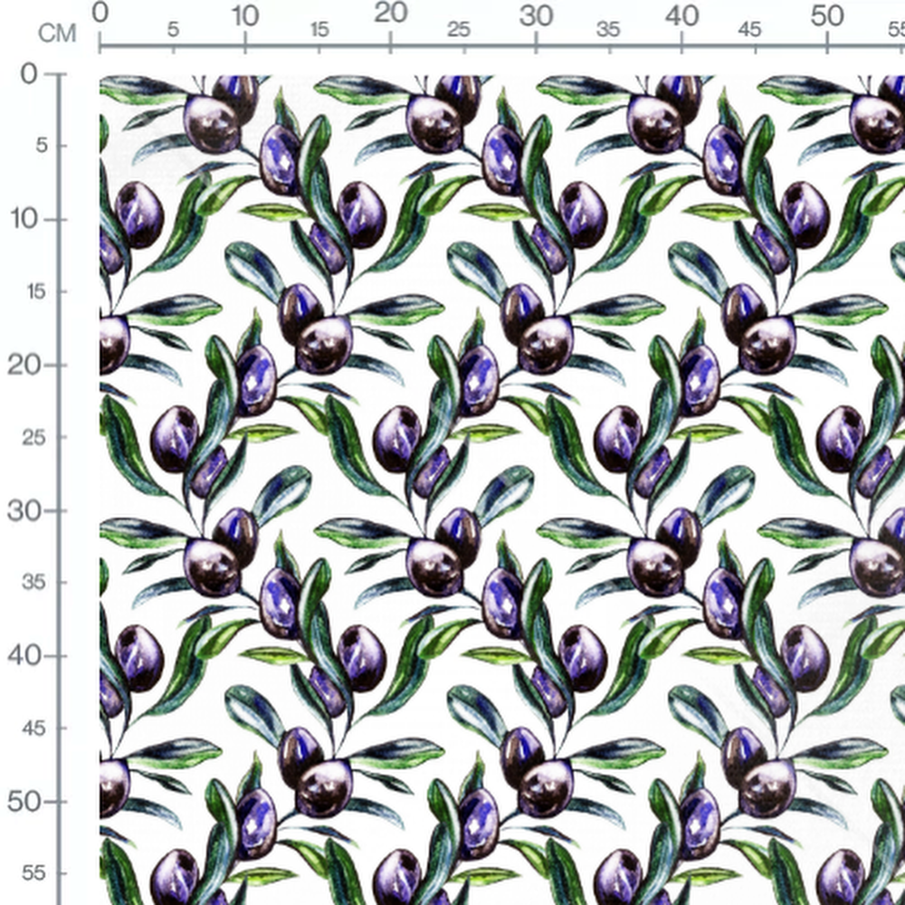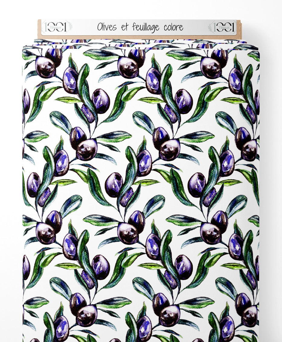 Les olives sont d'un violet profond et brillant. Les feuilles présentent des nuances de vert et de bleu. Le motif est riche en détails naturels et vibrants.Les tissus