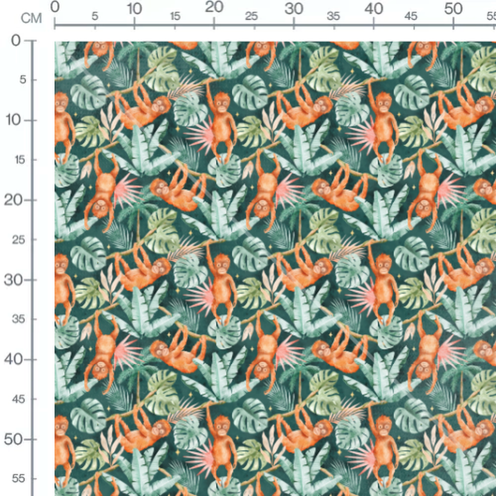 Les orang-outans sont suspendus à des branches. Les feuilles sont de différentes formes et nuances de vert, avec des touches de rose.Les tissus