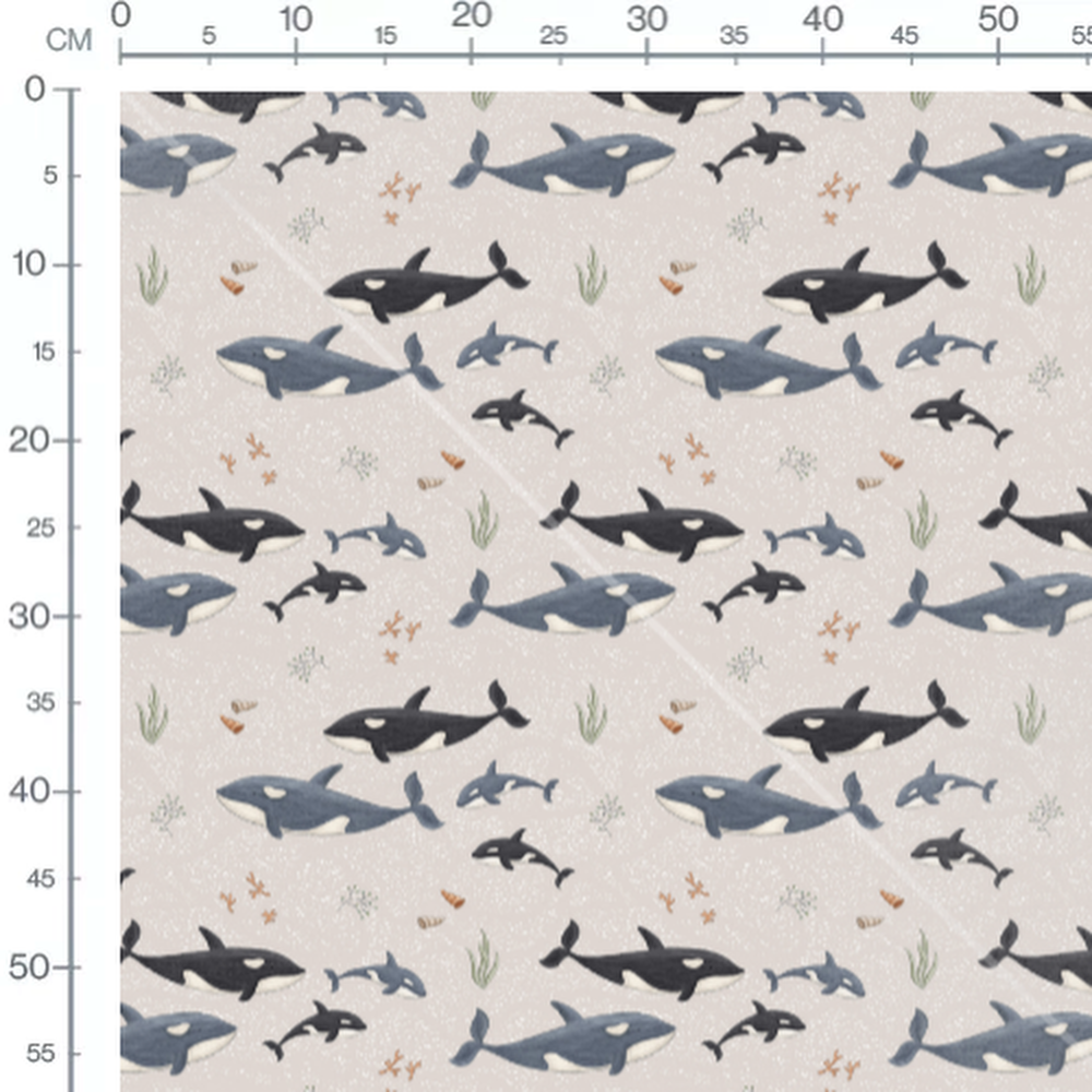 Petites algues vertes ajoutent une touche de nature. Les orques sont noirs avec des taches blanches distinctives. Les dauphins sont d'un bleu doux, contrastant avec le fond clair.Les tissus