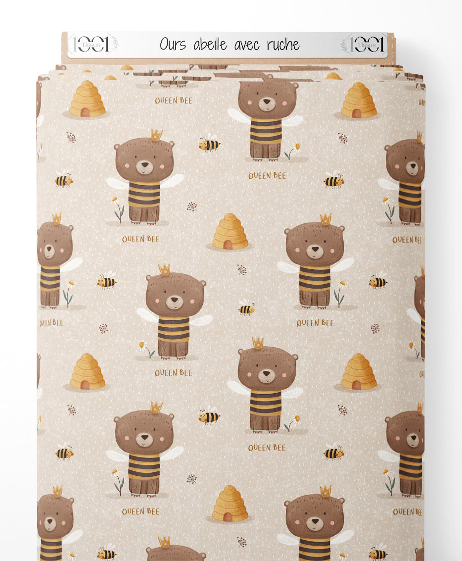 Les ours portent des rayures noires et jaunes et des ailes blanches. Des ruches jaunes et des abeilles volent autour des ours. Quelques fleurs et inscriptions 'Queen Bee' complètent le motif.Les tissus