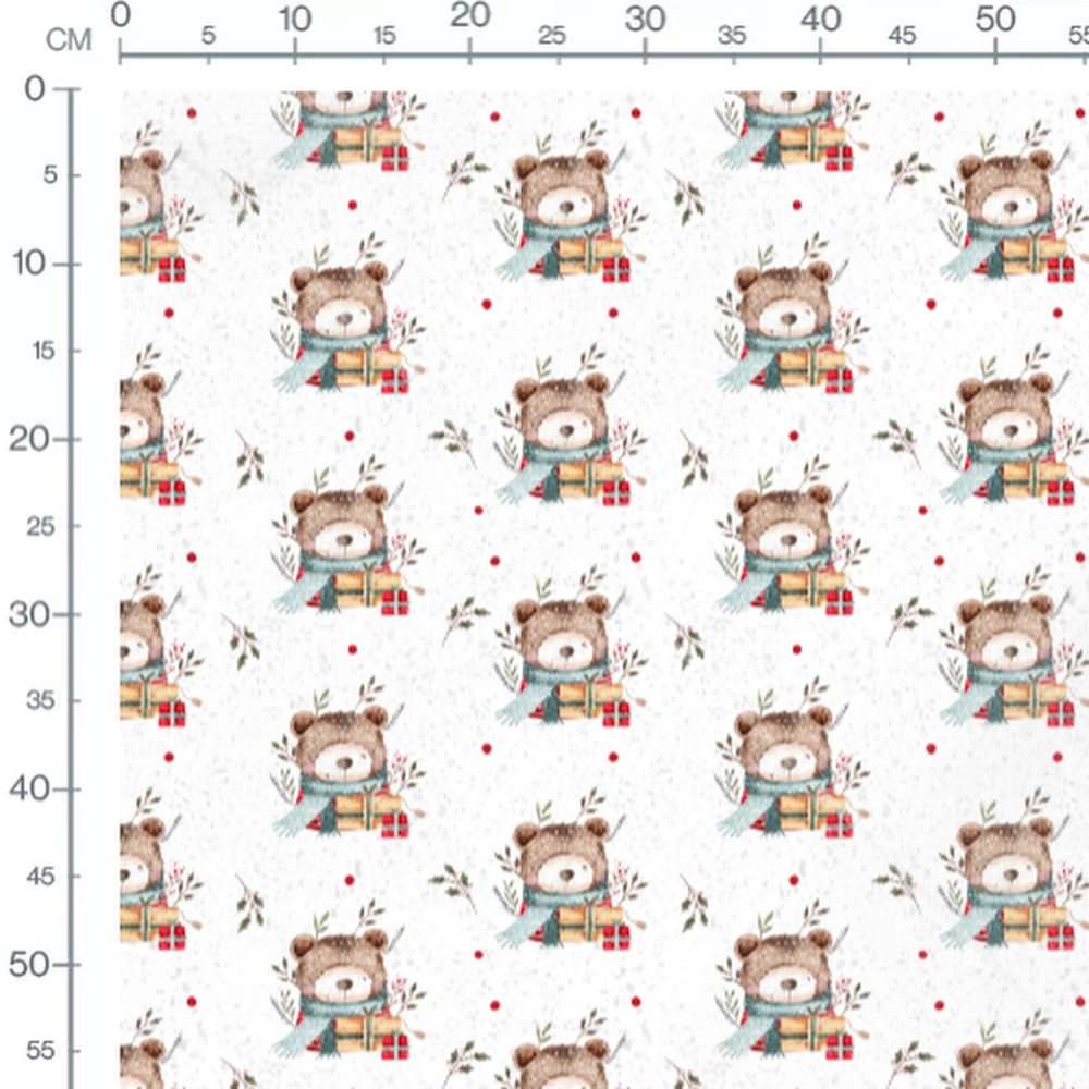 L'ours porte une écharpe bleue et est entouré de cadeaux rouges et dorés. Des branches de houx et des baies rouges complètent le motif festif. Le fond blanc est parsemé de petites taches grises.Les tissus