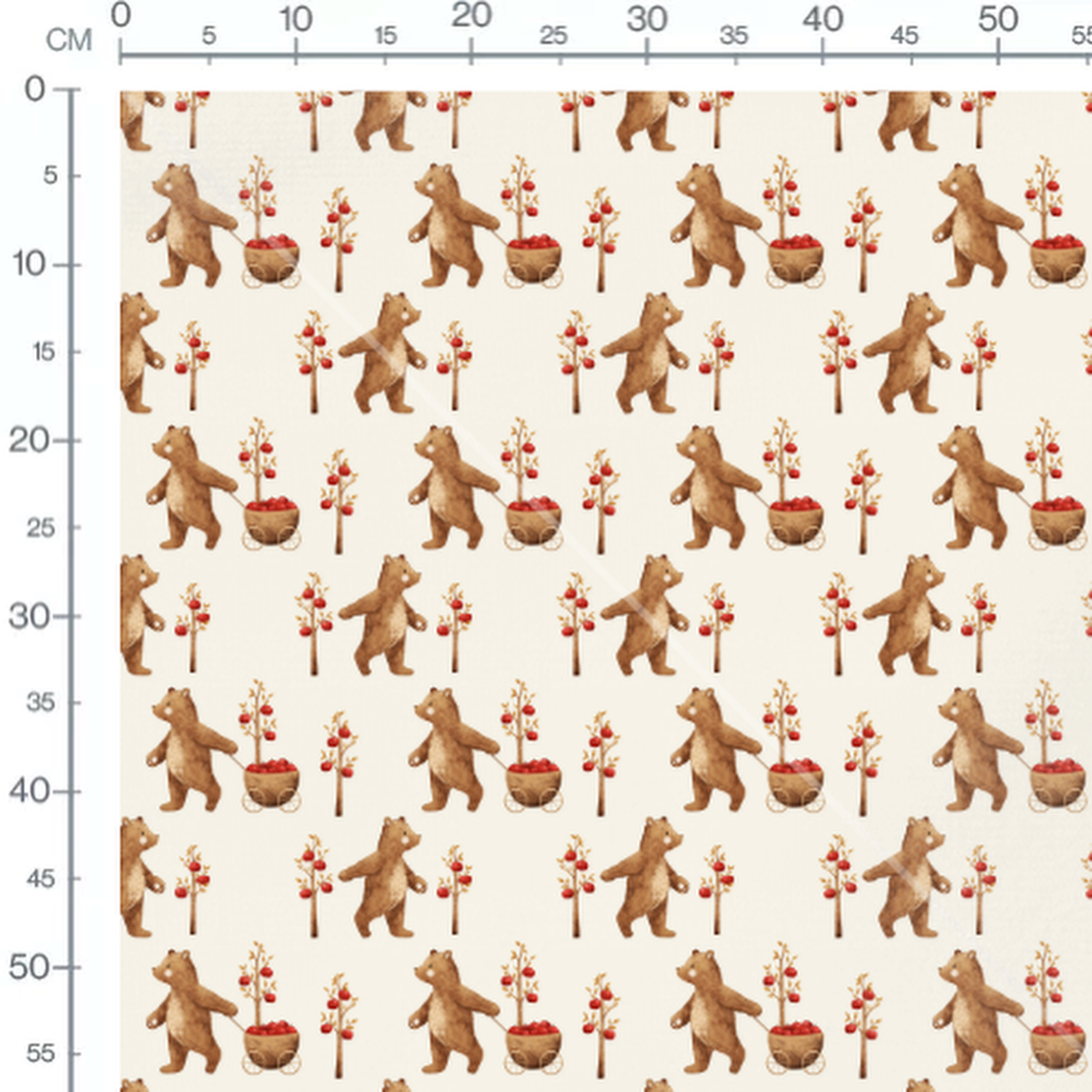 Les ours bruns tirent un chariot rempli de pommes rouges. Les arbres sont ornés de pommes rouges vives. Le fond beige met en valeur les motifs d'ours et de pommes.Les tissus