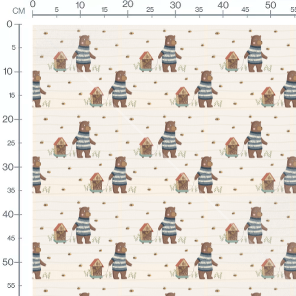 Les ours portent un pull rayé bleu et blanc. Les ruches sont sur des chariots à roulettes. Les abeilles volent autour des ours et des ruches. De petites plantes vertes parsèment le fond beige.Les tissus