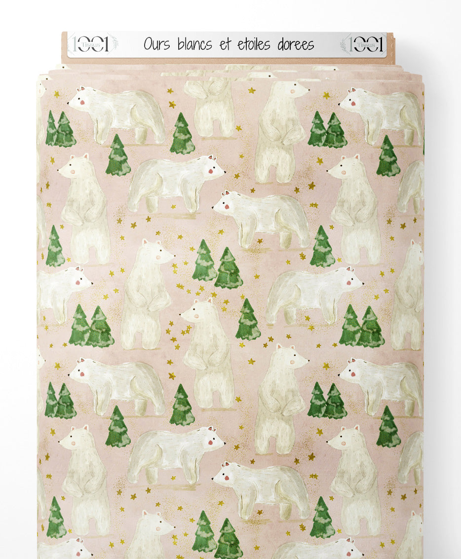 Tissu - Ours blancs et étoiles dorées