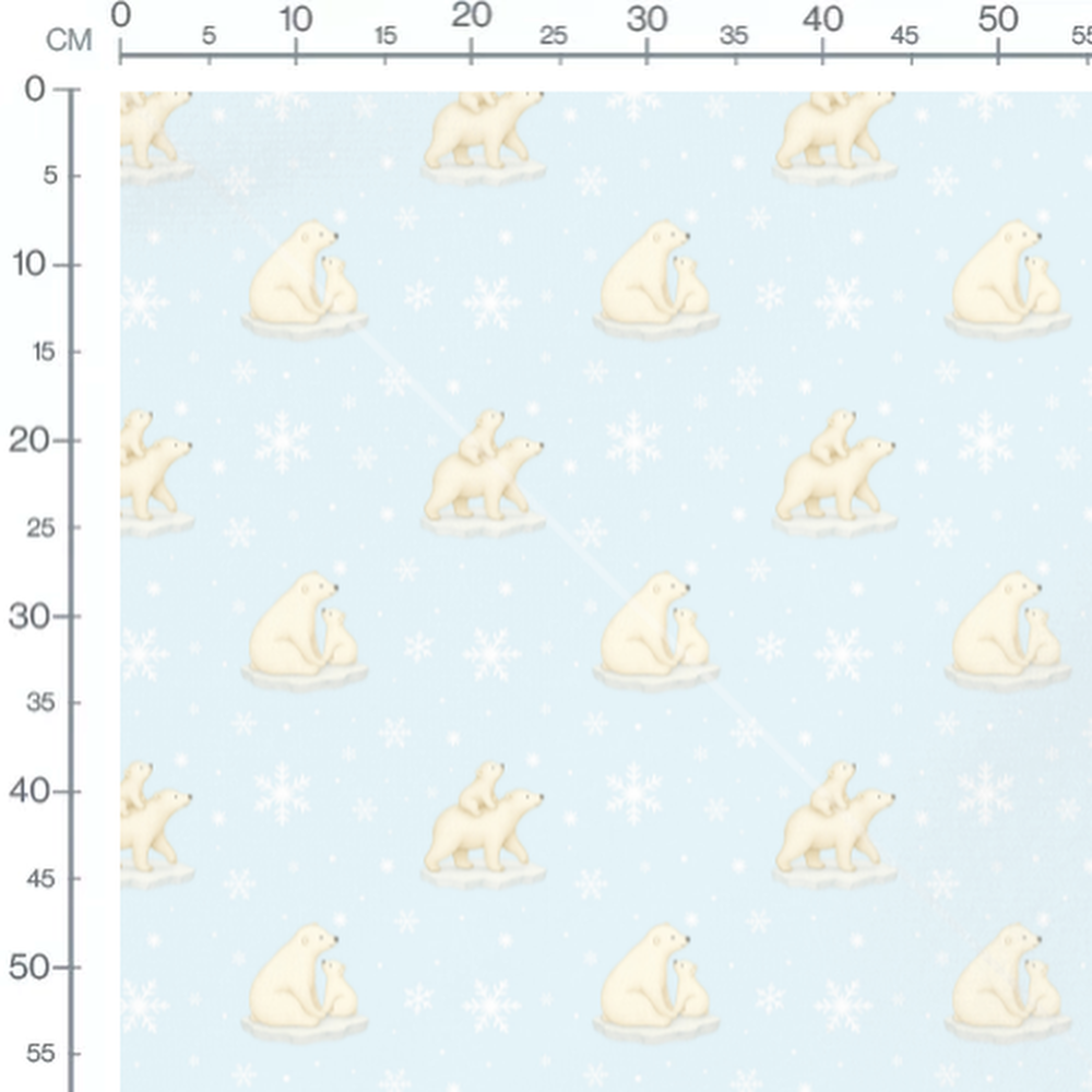 Les ours polaires sont assis sur des blocs de glace. Le fond bleu clair est parsemé de flocons de neige de différentes tailles.Les tissus