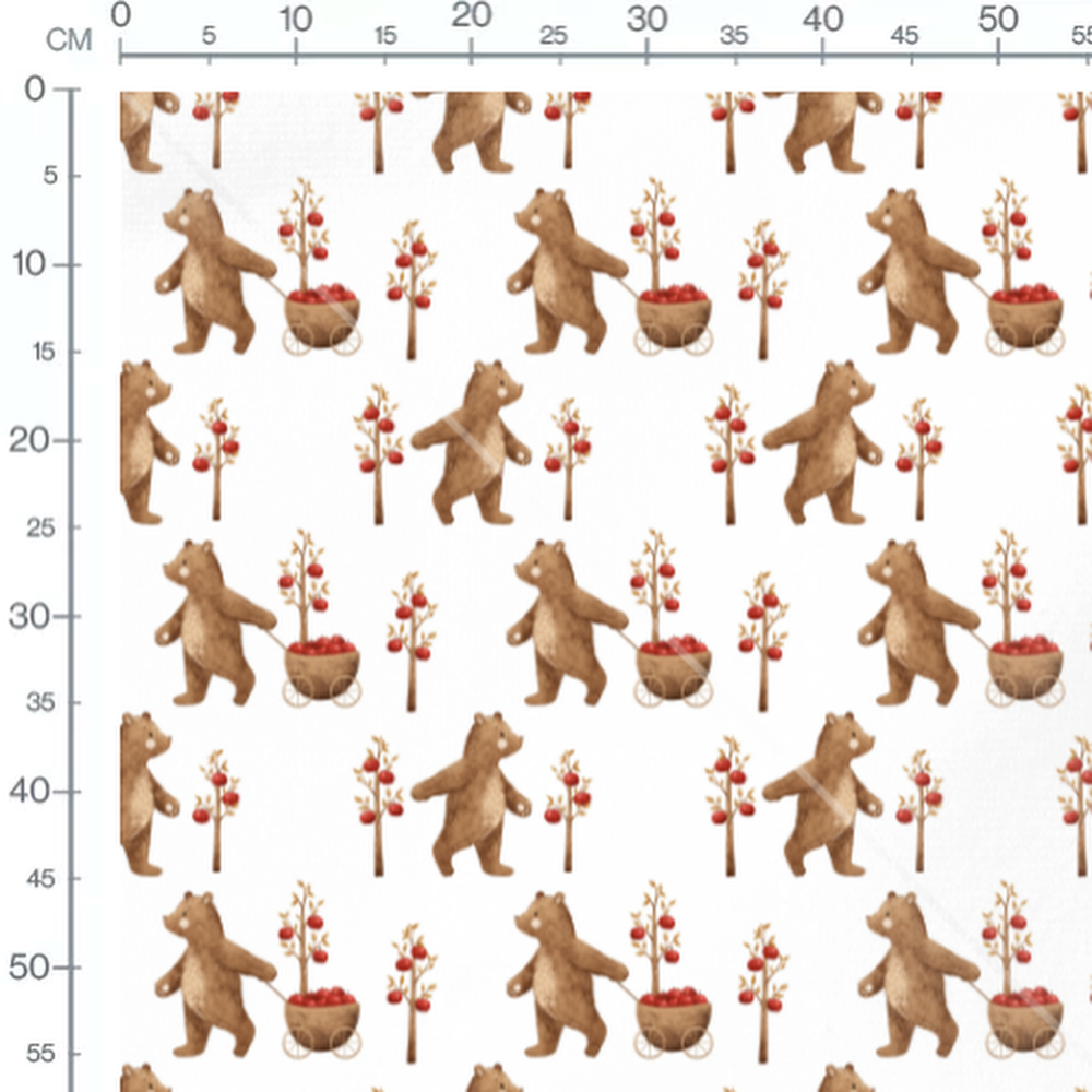Les ours bruns sont représentés de manière ludique avec des chariots remplis de pommes rouges. Les arbres environnants sont ornés de pommes rouges, ajoutant une touche de couleur vive au motif.Les tissus