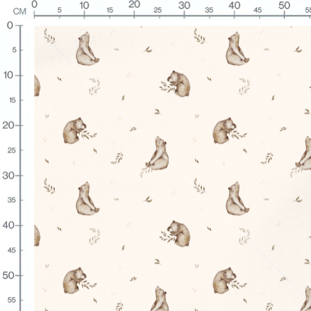 Les ours bruns sont dessinés dans différentes positions, tenant parfois des branches. Les feuillages sont de couleur verte et marron, ajoutant une touche naturelle au motif.Les tissus