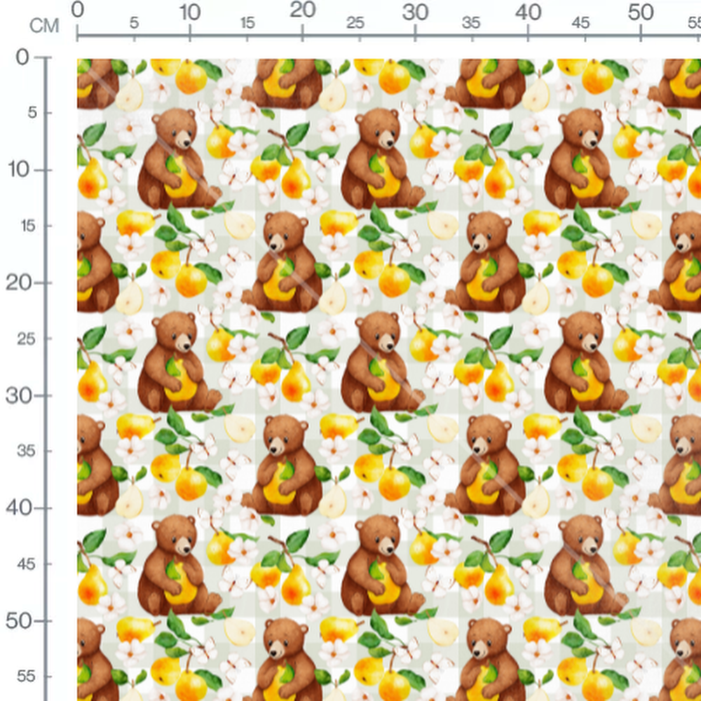 Les ours bruns sont entourés de poires jaunes et de fleurs blanches. Des papillons blancs volent parmi les éléments. Les feuilles vertes ajoutent une touche de nature au motif.Les tissus
