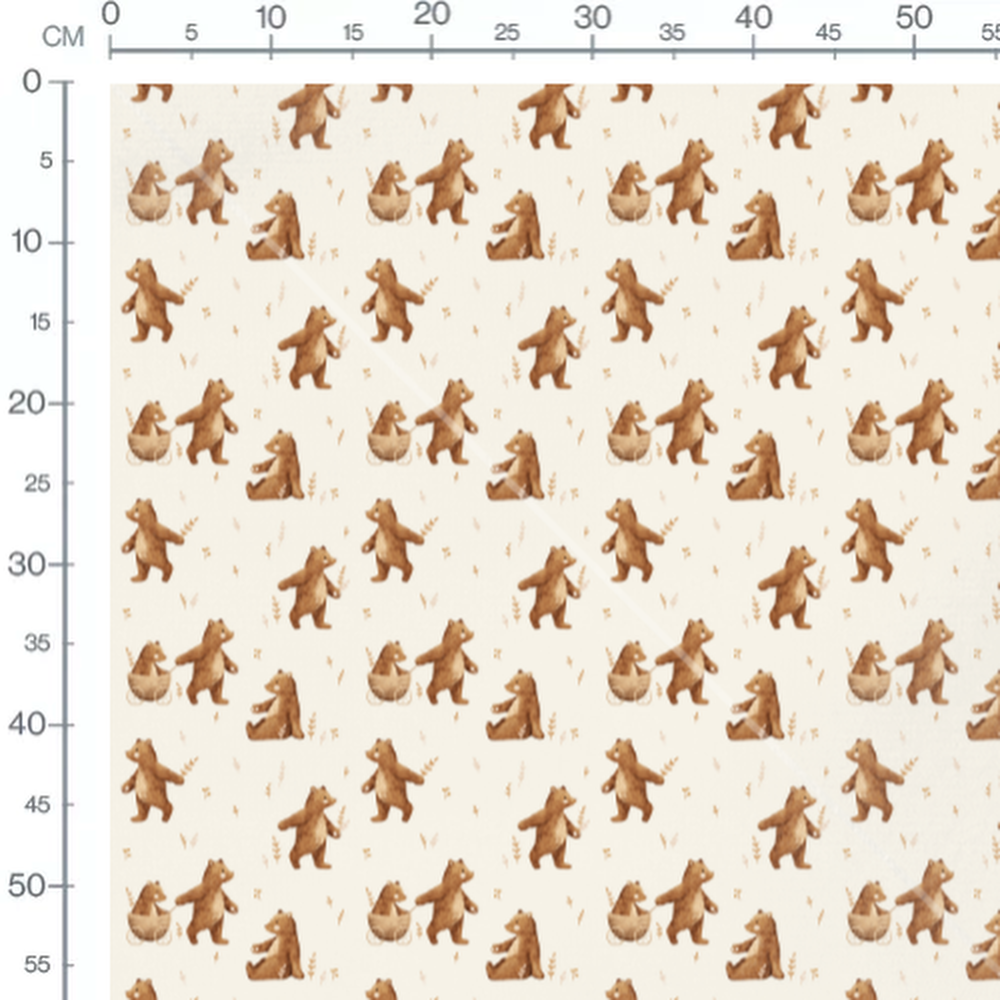 Les ours bruns sont représentés dans différentes positions, certains marchant, d'autres assis. Une poussette avec un ourson est également visible parmi les motifs.Les tissus