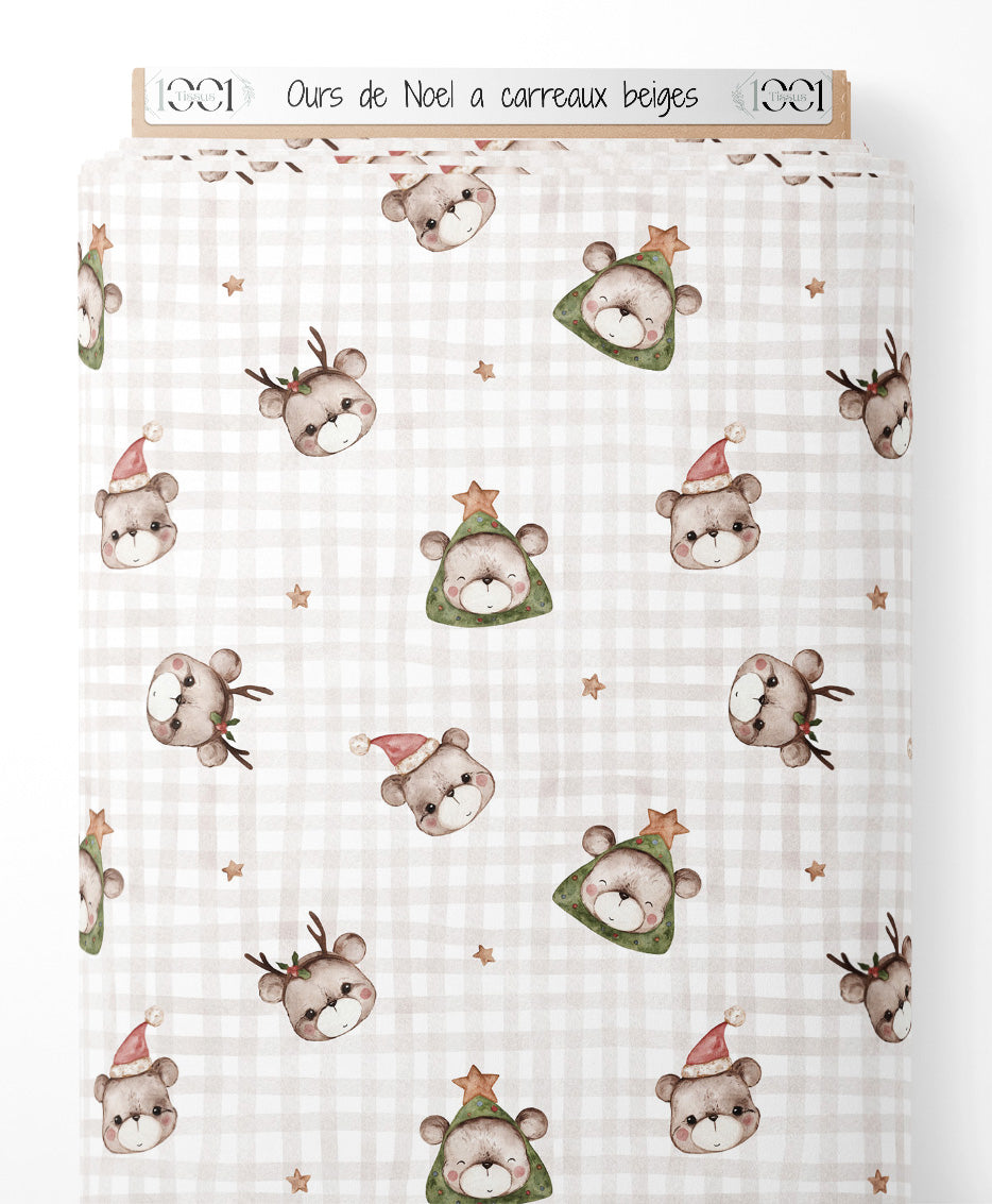 Les ours portent des chapeaux de Noël rouges et verts. Certains ours ont des bois de renne. Le fond est constitué de carreaux beiges clairs.Les tissus