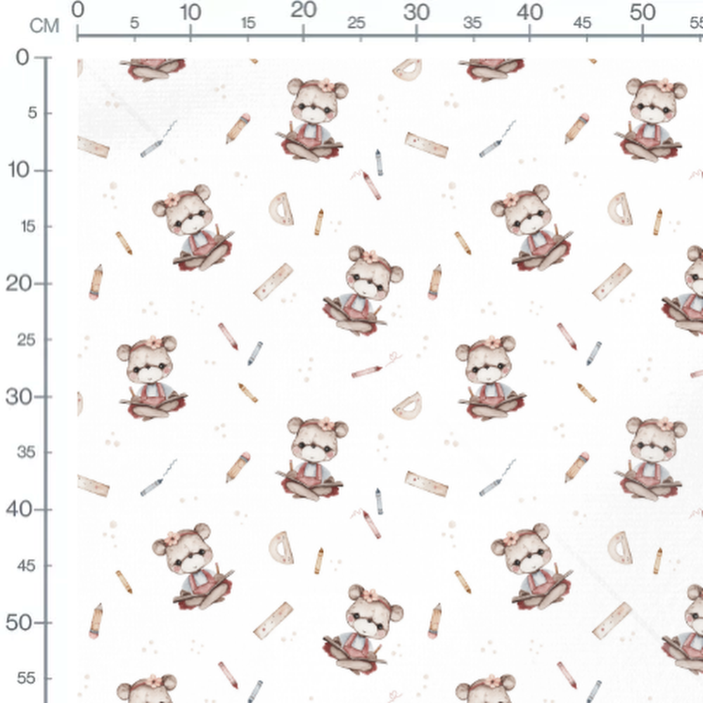 Les ours portent des vêtements et tiennent des crayons. Des crayons de couleur et des règles sont éparpillés sur le fond. Les ours ont des nœuds sur la tête.Les tissus