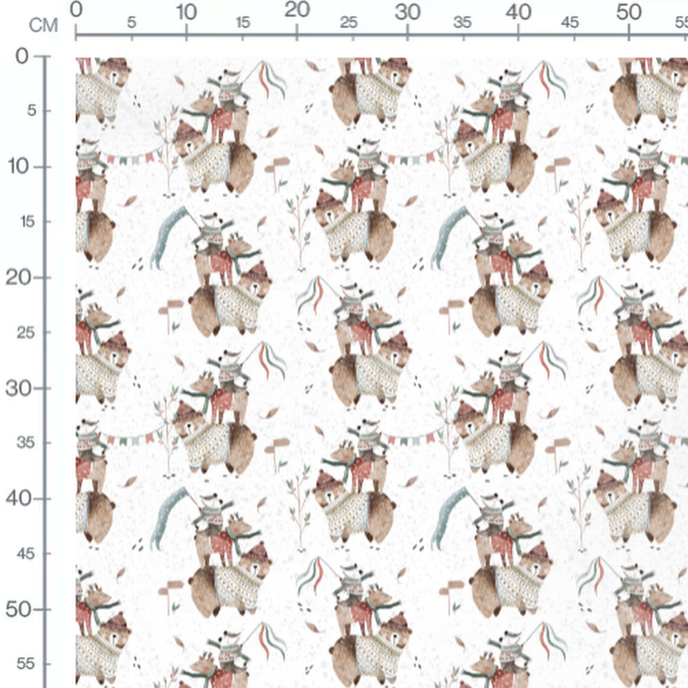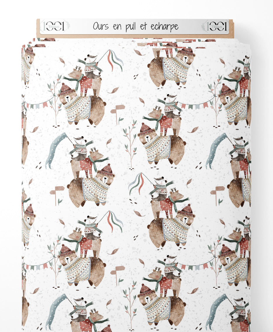 Les ours portent des pulls à motifs et des écharpes colorées. Des drapeaux multicolores flottent à côté des ours. De petites feuilles et des flocons parsèment le fond blanc.Les tissus