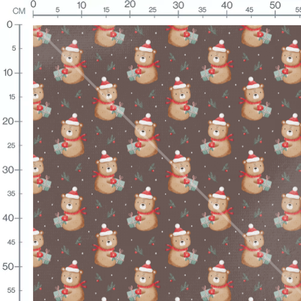 Les ours portent des bonnets rouges et des écharpes assorties. Les cadeaux sont décorés de rubans rouges. Des petites baies rouges et des branches de sapin complètent le motif.Les tissus