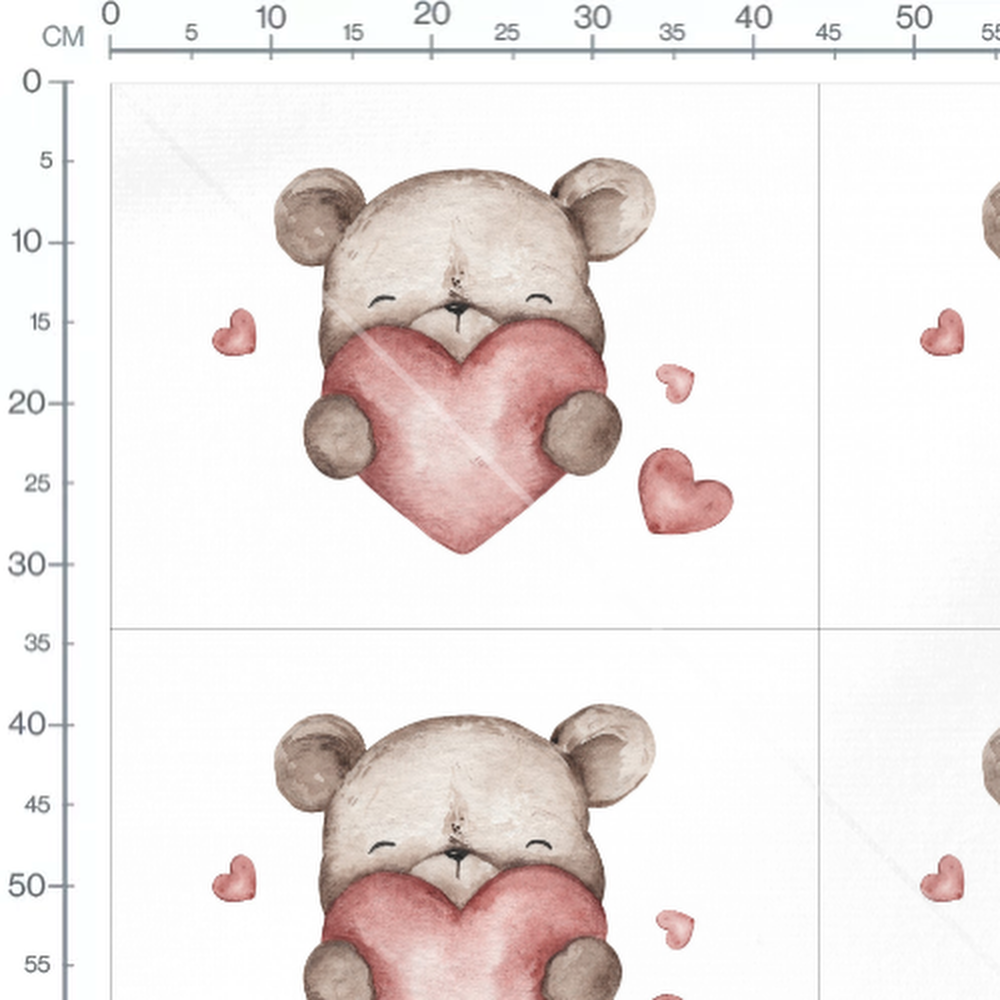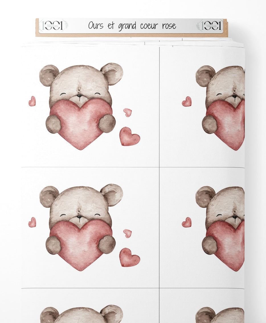 L'ours a une expression joyeuse et tient un grand cœur rose. Les petits cœurs roses ajoutent une touche de douceur autour de l'ours.Les tissus