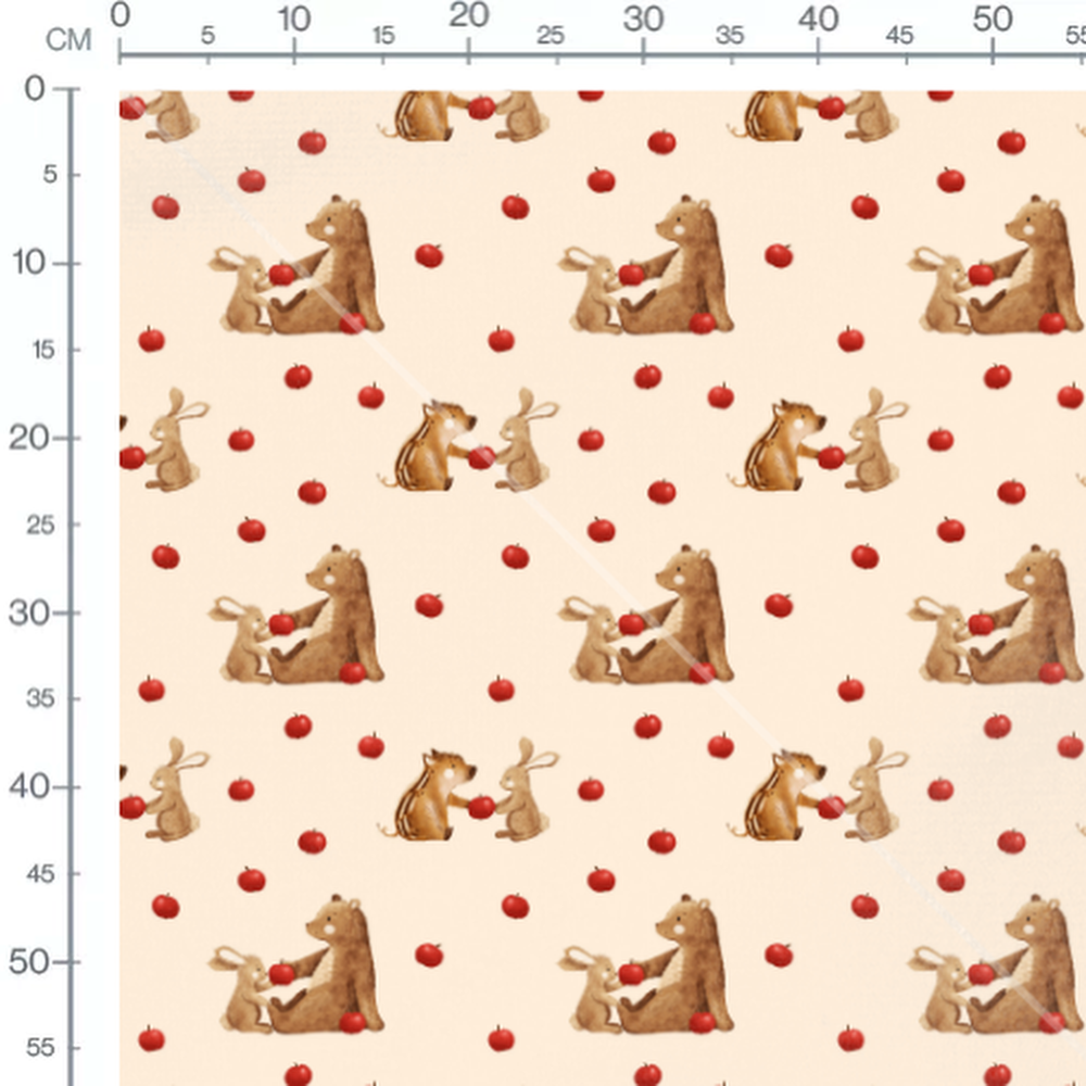 Un ours brun assis tenant une pomme rouge avec un lapin brun. Plusieurs pommes rouges entourent les animaux sur un fond beige clair.Les tissus