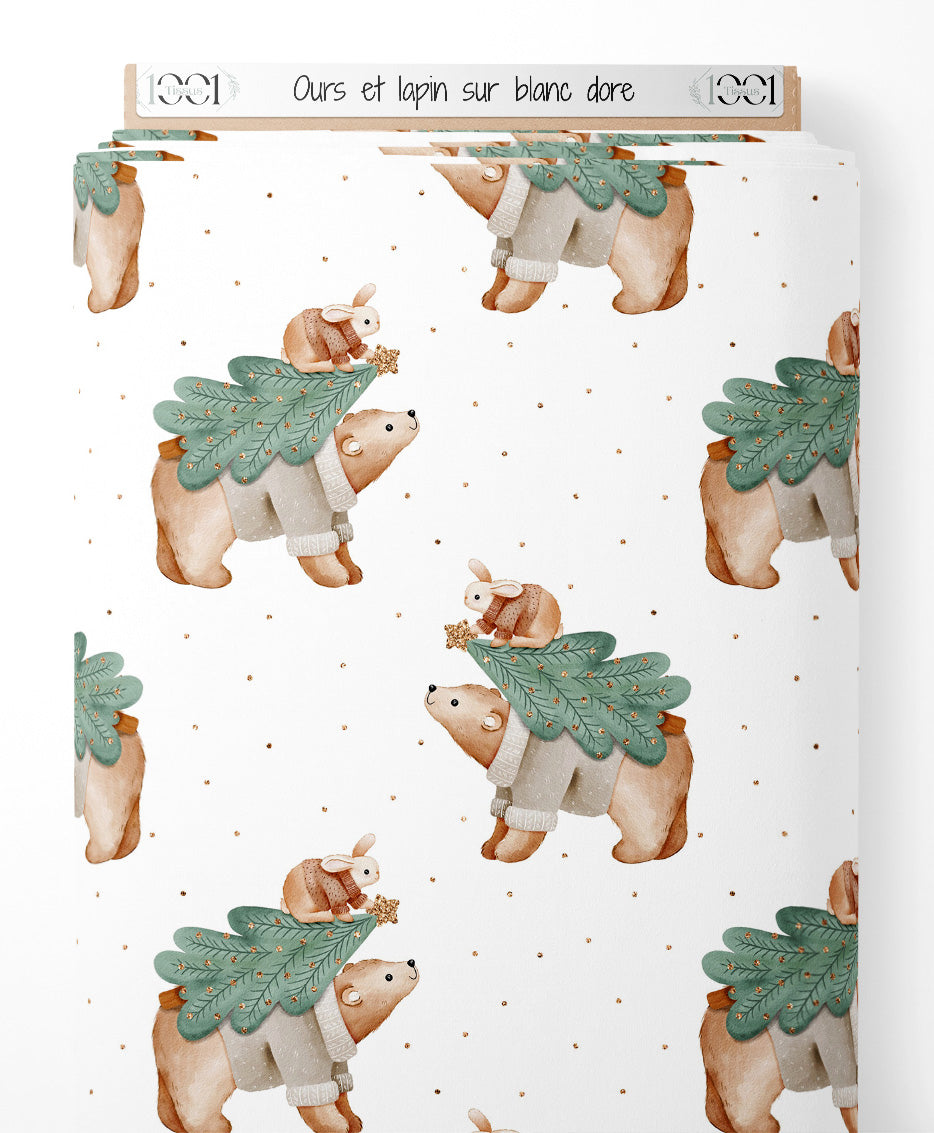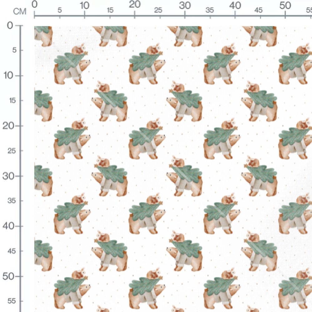 Le lapin porte un pull et tient une étoile. L'ours est habillé d'un pull gris clair. Les sapins verts sont décorés de petites baies dorées.Les tissus