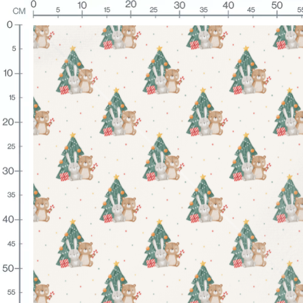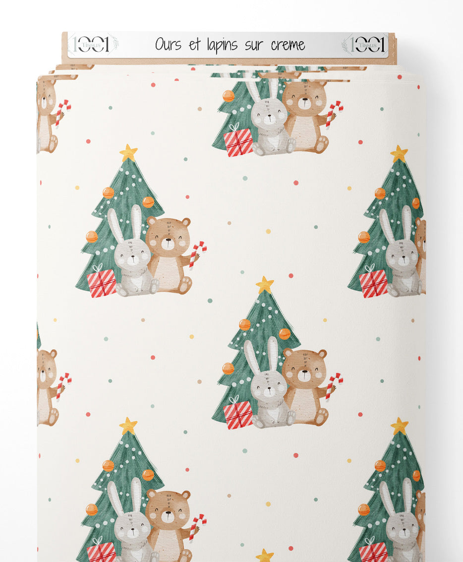 Les ours tiennent des cannes à sucre rouges et blanches. Les lapins sont assis à côté de cadeaux rouges à rayures blanches. Des points colorés rouges, verts et jaunes parsèment le fond.Les tissus